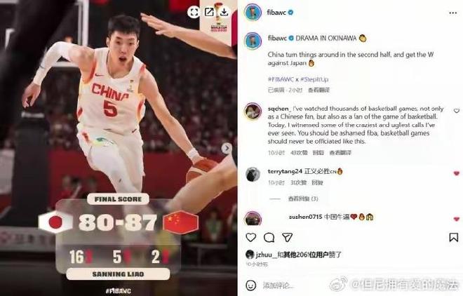 令人惊讶的是,赛后,FIBA世界杯的Instagram官方账号却这样写道:“冲绳神剧本!中国男篮从日本偷走一场胜利(China with a sneaky win over Japan)。”这样的描述引发了评论区翻车。