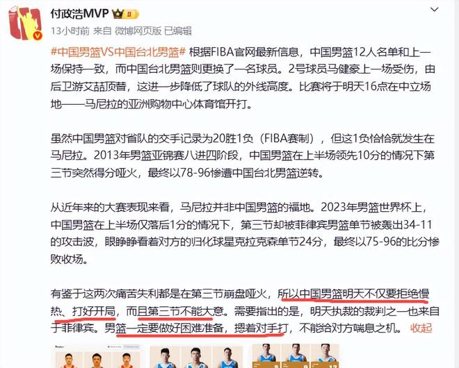 马尼拉并不是中国队的福地,在这个地方中国队曾经两次翻车。2013年男篮亚锦赛八进四阶段,中国男篮在上半场领先10分的情况下第三节突然哑火,最终以78-96惨遭台北男篮逆转。时隔10年,也就是2023年男篮世界杯上,中国队上半场仅落后1分,但第三节又突然哑火,被菲律宾男篮以96-75大比分击败。只能说马尼拉是中国男篮的伤心地。尽管对手是省队,但是国家队来不得半点轻视和大意。
