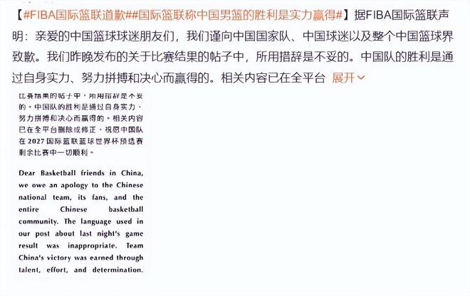 可这份道歉里,从头到尾没有一句提及裁判的问题,没有一句反思吹罚的不公,甚至连一句对中国男篮的真切歉意都没有。