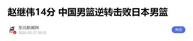 参考资料:《赵继伟14分 中国男篮逆转击败日本男篮》